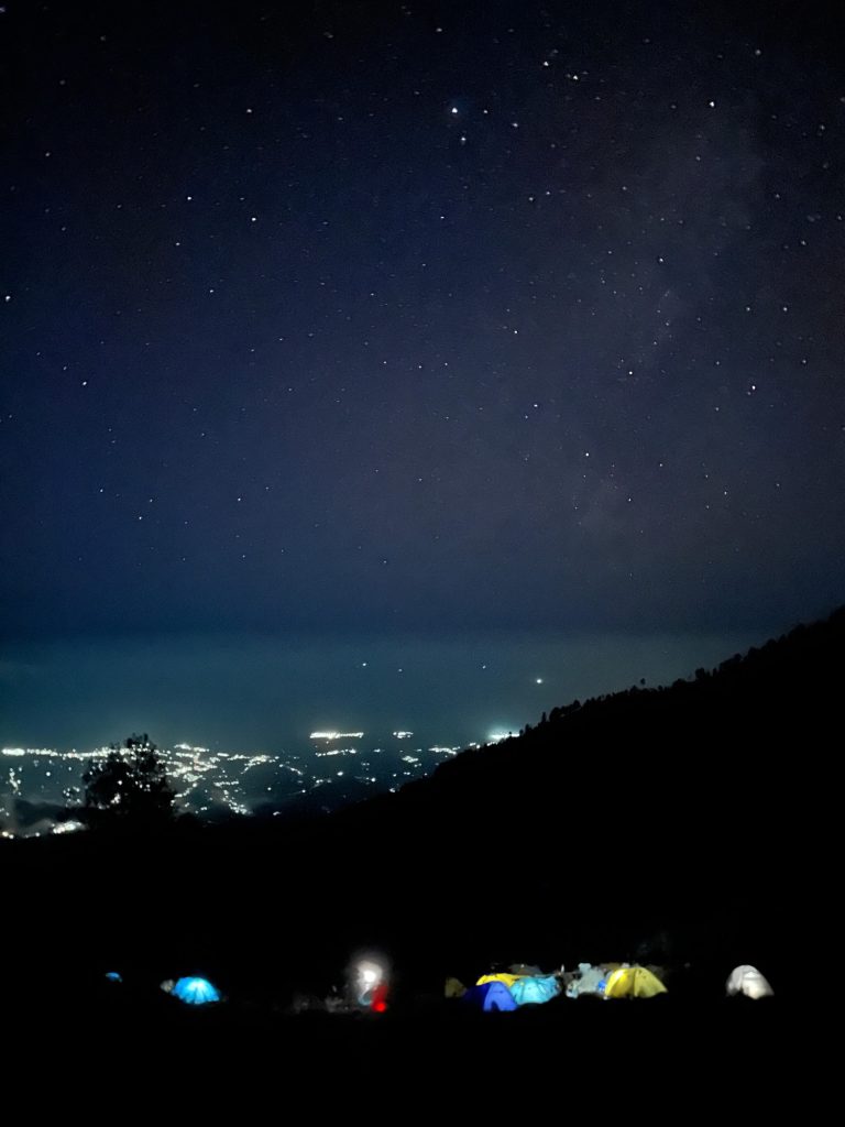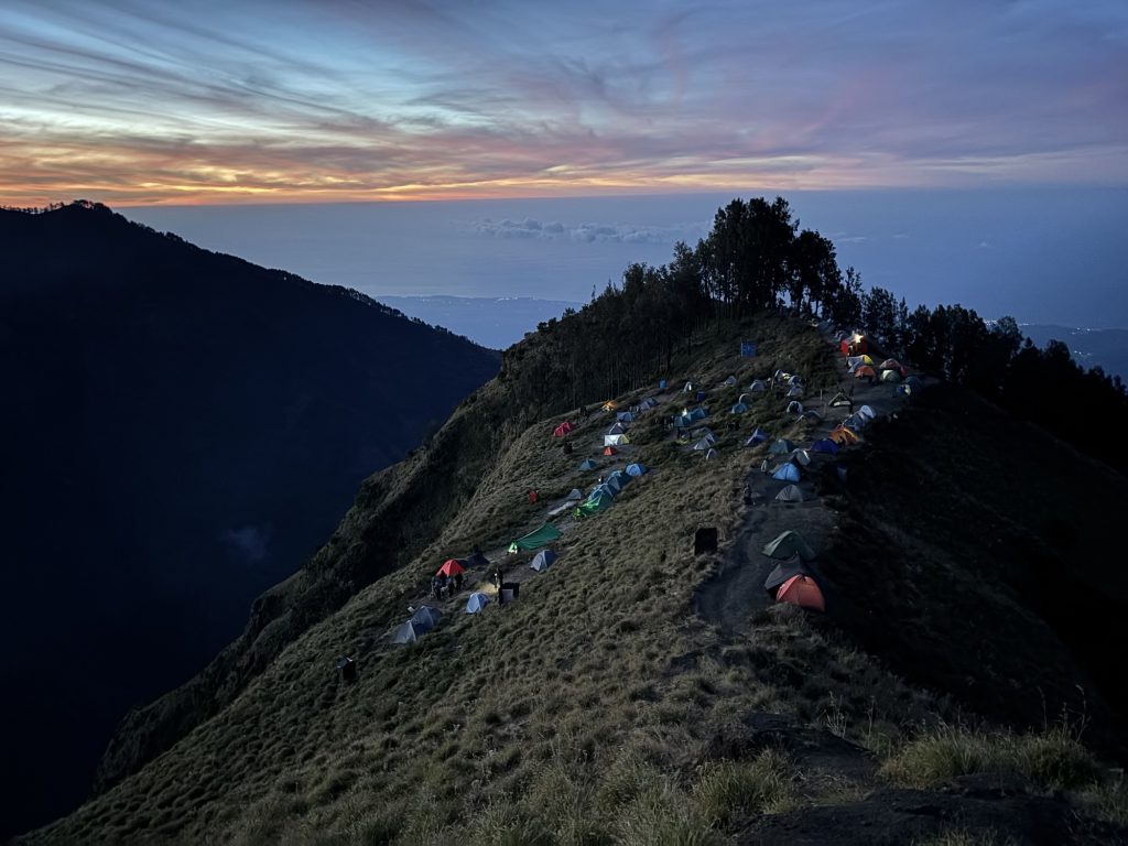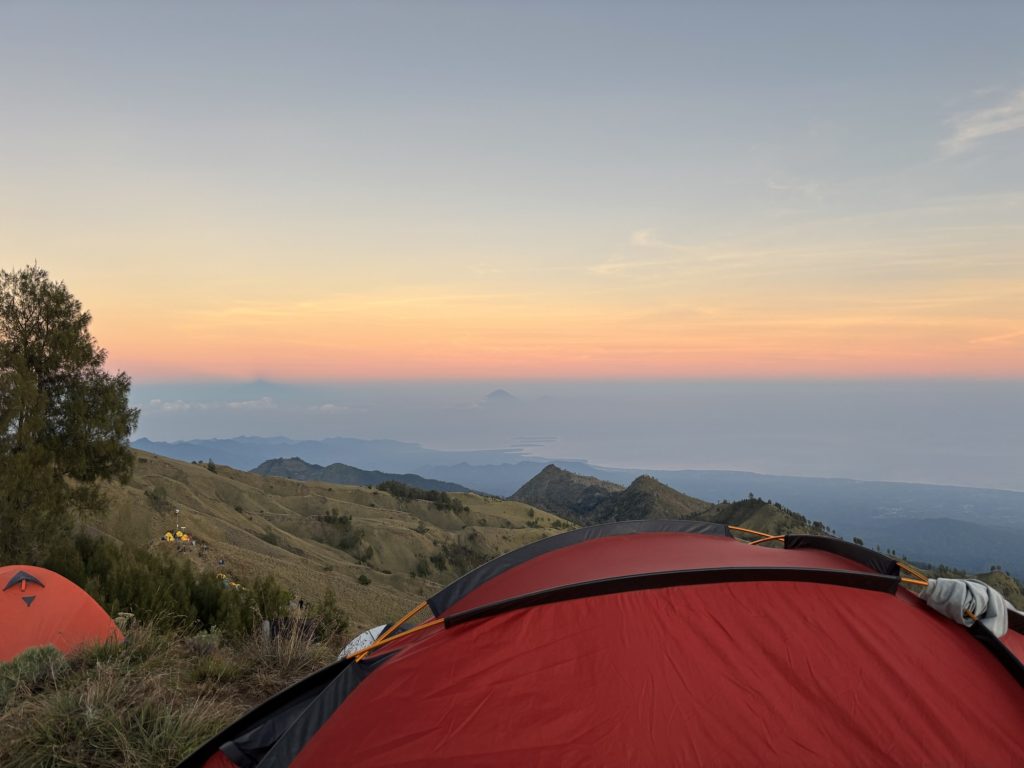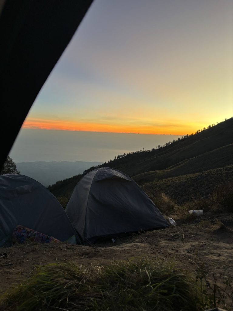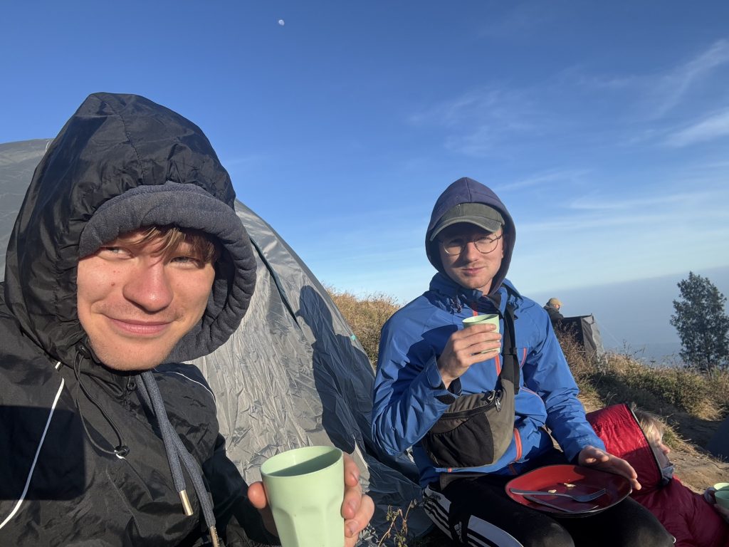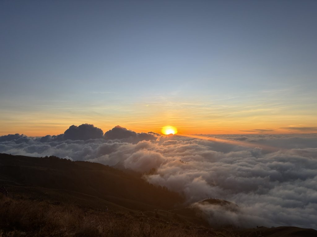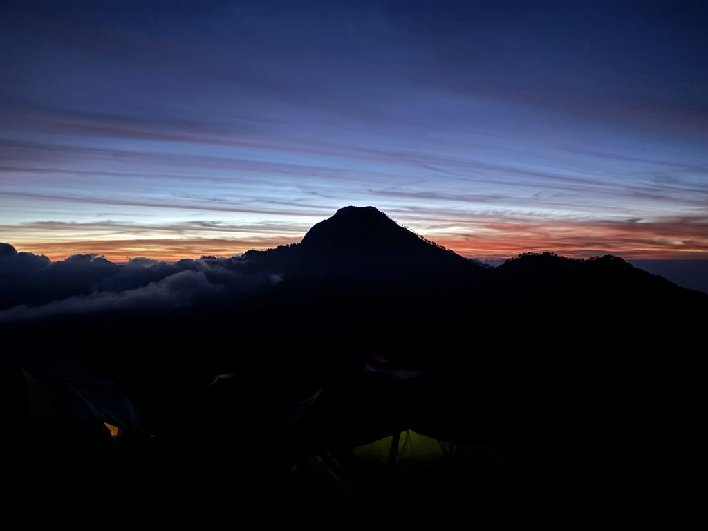 Danach wurde wieder gekocht, es gab diesmal statt Reis Nudeln mit Gemüse. Yuhu. Die Wanderung zum nächsten Crater Rim war dann wieder sehr hart. Die Wanderung vom Tag davor steckte uns noch in den Füßen, und auf über 2000 Metern ist jeder Schritt gefühlt nochmal deutlich anstrengender. Gegen 16:00 kamen wir dann beim Kraterrand an. Internet gab es diesmal am Camp überhaupt nicht, ich ging von Hügel zu Hügel bis ich irgendwann ein bisschen Netz hatte und versuchte die Rück und Weiterfahrt für den nächsten Tag zu organisieren. Der Sonnenuntergang war wieder wunderschön. Das Essen hat etwas länger auf sich warten lassen, dafür hatten wir aber den Luxus es im Zelt essen zu dürfen weil es draußen schon so kalt war. Die Nacht sollte etwas kürzer werden, gegen 2 Uhr war aufstehen angesagt. Zum Sonnenaufgang wollten wir auf dem Gipfel sein. Den Aufstieg beschrieb unser Guide noch kurz vorm Schlafen gehen in etwa so: Die 1. Stunde ist steil, die 2. Stunde ist relativ entspannt und eher flach, über die 3. Stunde möchte ich nicht reden.
