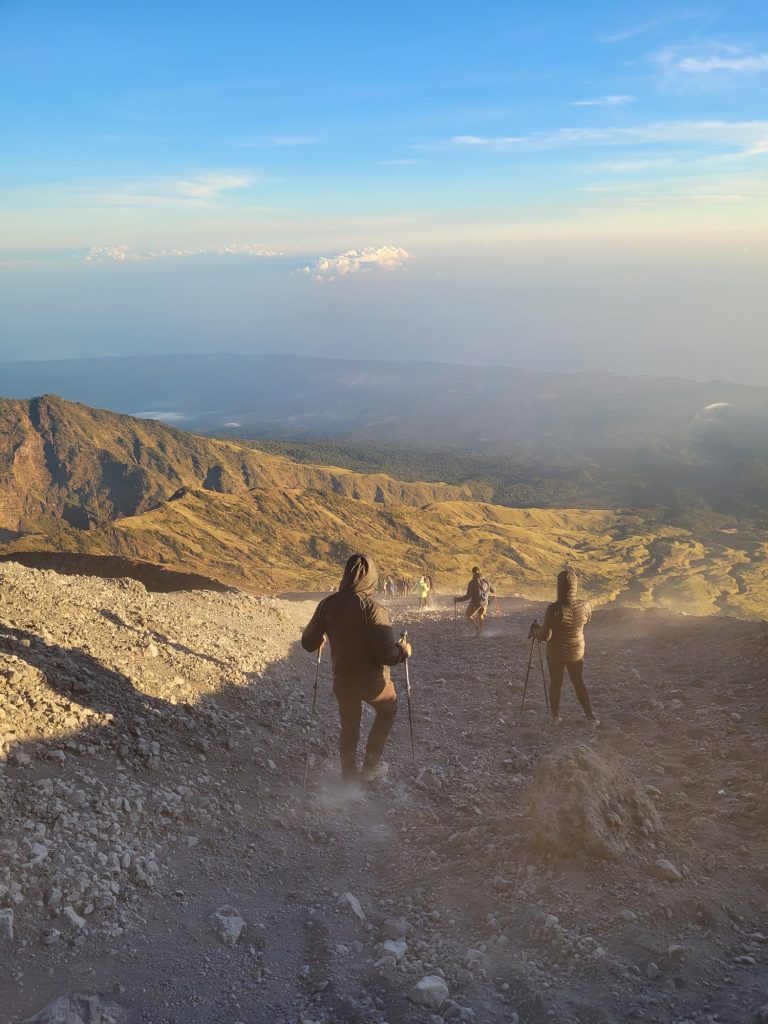 Ungefähr eine Stunde verbrachten wir oben auf dem Gipfel, der Wind hatte nachgelassen und spätestens mit der ersten Wärme der Sonen war es sehr gut aushaltbar. Danach begann der Abstieg, der Teil vor dem ich am meisten Respekt hatte. Von 3700 Höhenmetern auf 1100 nach Sembalun klang für mich nicht wirklich nach einer schönen Erfahrung. Doch zumindest der Abstieg vom Gipfel zum Camp war sehr angenehm. Der Vulkansand ist zwar zum Aufstieg die Hölle, zum Abstieg jedoch ein wahrer Segen. Mit jedem Schritt runter rutscht man einen weiteren den Berg hinab und muss die Energie nicht mit seinen Beinen abfangen. Das übernimmt der Vulkansand für einen. Und so „rutschten“ wir in knapp 1.5h den Berg wieder runter, das hat echt Spaß gemacht.