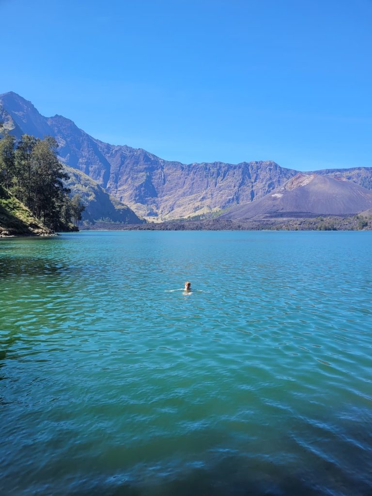 Zu 6. ging es dann also weiter zur 2. Etappe. Heute ging es dann vom Senaru Crater Rim zum Sembalun Crater Rim. Zunächst ging es 600 Höhenmeter runter zum Segare Anak Lake, dem großen Vulkansee. Der Weg war zwischenzeitlich echt ziemlich abenteuerlich. Unten am Vulkansee hatte man nochmal ne andere Perspektive und wir konnten im Vulkansee schwimmen. Unsere Guides guckten uns nur komisch an, ihnen war das Wasser viel zu kalt. Ich hätt gesagt es war Ostsee Temperatur.