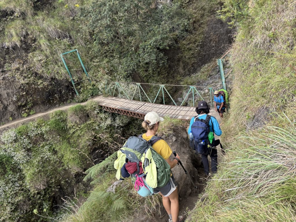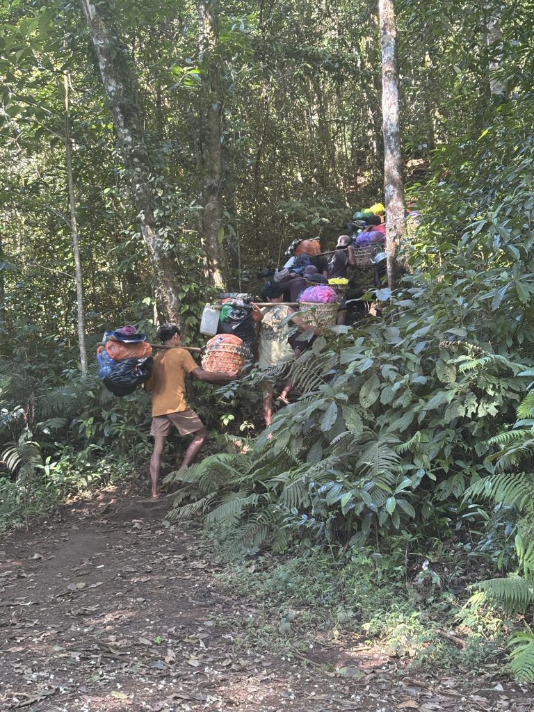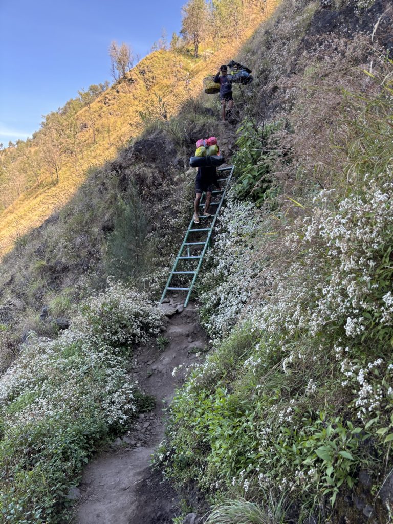 Das Auto lud uns dann allerdings nicht in Sembalun ab, sondern mitten im Jungle von Senaru. Auf Nachfrage erfuhren wir dass wir die Tour andersherum machen würden. Warum wissen wir bis heute nicht wirklich, naja… Am ersten Tag durften wir dann also statt 1500 jetzt 2000 Höhenmeter aufsteigen. Die Begeisterung war jetzt nicht so sonderlich groß, aber wir hatten auch nicht wirklich das Gefühl jetzt noch was daran ändern zu können. Über wilde Wege ging es langsam aber stetig den Berg hoch, zwischendurch wird man immer wieder von den Portern überholt. Auf Flip Flops tragen sie auf ihren Schultern Zelte, Essen und andere Dinge den Berg hinauf.