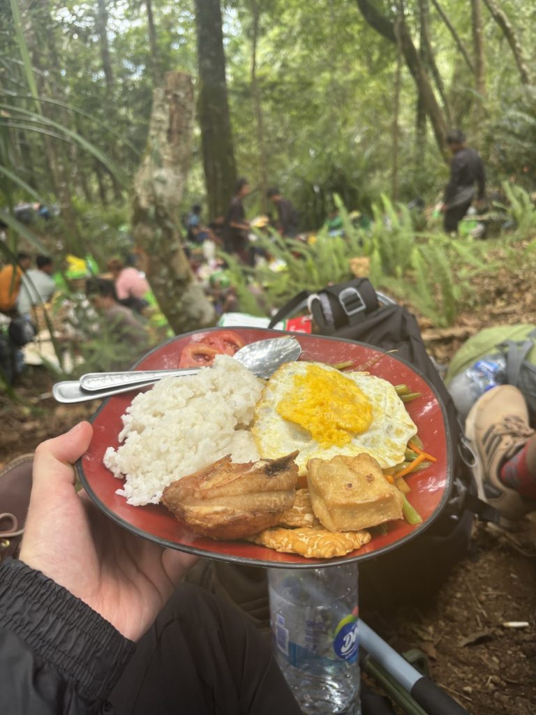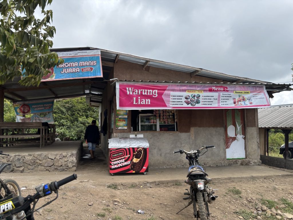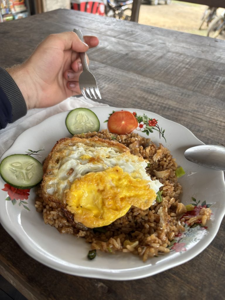 Niemand (inklusive mir) hatte jedoch damit gerechnet dass ich schon um 12 unten war, ich fand schon die Schätzung vom Guide (13-14 Uhr) sportlich. So musste ich dann am Ende dann noch eine Stunde auf Thomas und Joel warten, so viel Früher konnte der Fahrer dann nicht losfahren. Gegessen hab ich in dem einen Warung (lokale Restaurants) in der Nähe vom Ausgang des Nationalparks, dort gab es Nasi Goreng. Es lag bestimmt auch an meiner Situation, aber ich fand eines der besten was ich je hatte. Gefühlt war ich der erste Touri der hier Essen bestellt hatte, in den Rinjani kommt man nur mit Guide und die fahren die Touris natürlich immer selber weg. Etwas verwundert dass ich alleine runtergekommen bin waren sie auch.