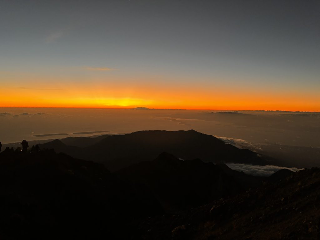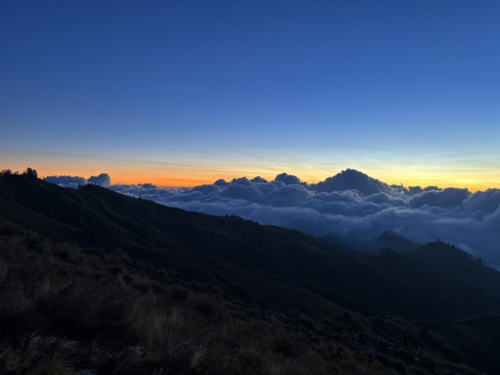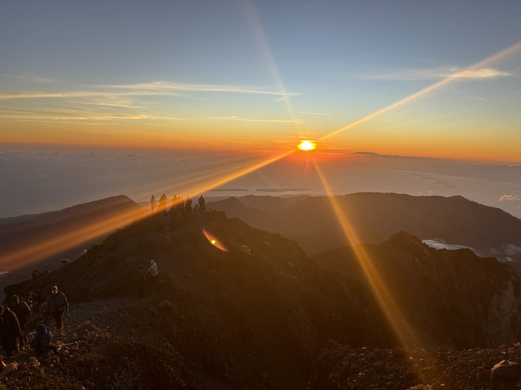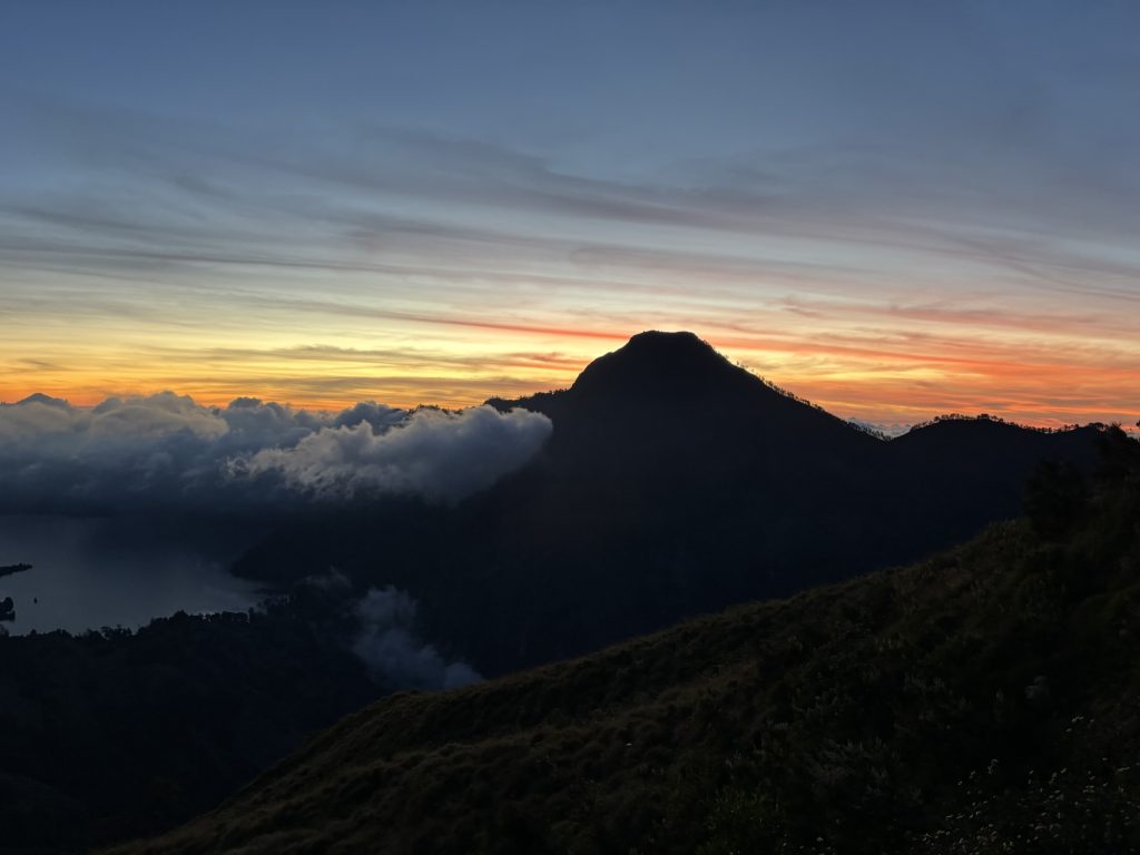 Gegen 5:30 waren wir dann oben und sicherten uns gute Plätze auf der Spitze, viele hatten wir auf dem Weg nach oben eingeholt. Langsam begann die Sonne aufzugehen, auf der einen Seite hatte man einen wunderschönen Blick auf den Vulkansee und auf der anderen Seite ging die Sonne zwischen den Bergen von Lombok und West-Nusa Tenggara auf. Definitiv mein Highlight der Wanderung, der Aufstieg hatte sich definitiv gelohnt.