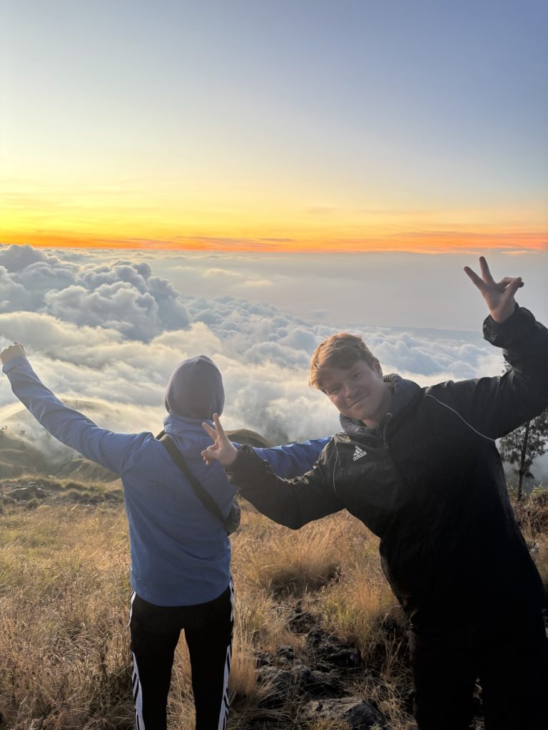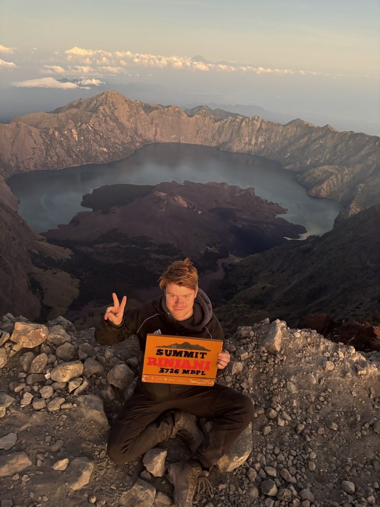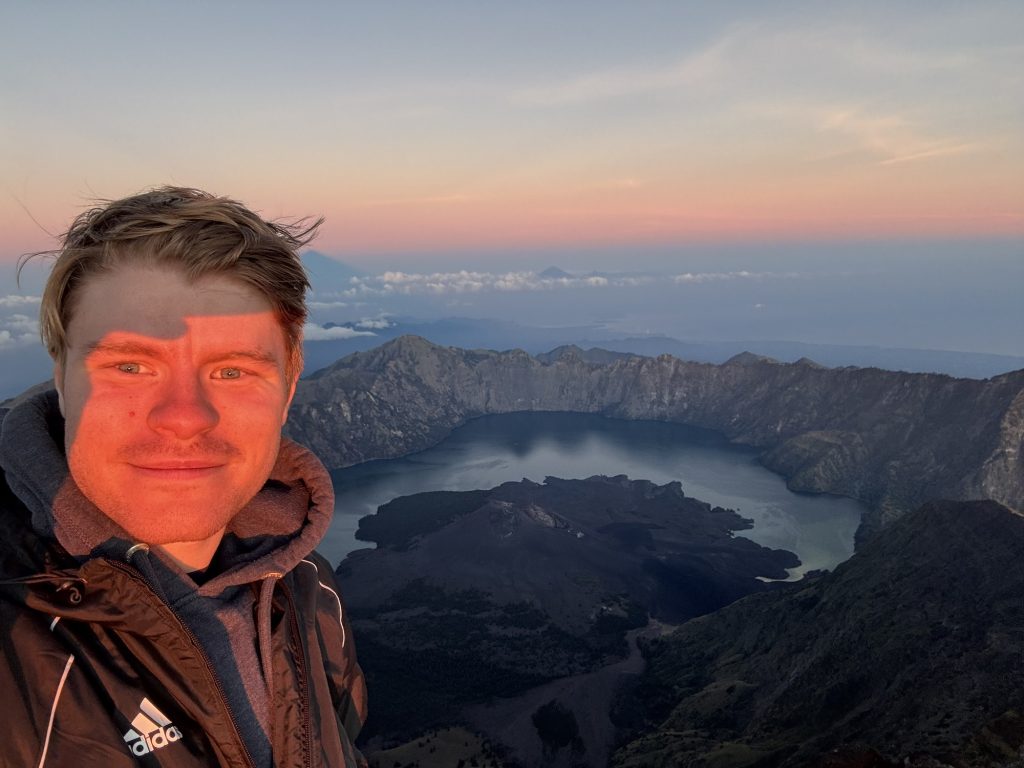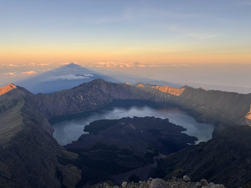 Gegen 5:30 waren wir dann oben und sicherten uns gute Plätze auf der Spitze, viele hatten wir auf dem Weg nach oben eingeholt. Langsam begann die Sonne aufzugehen, auf der einen Seite hatte man einen wunderschönen Blick auf den Vulkansee und auf der anderen Seite ging die Sonne zwischen den Bergen von Lombok und West-Nusa Tenggara auf. Definitiv mein Highlight der Wanderung, der Aufstieg hatte sich definitiv gelohnt.