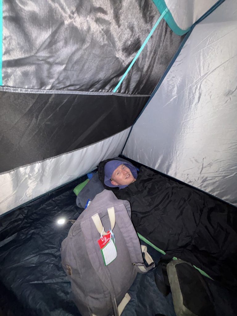 Nach dem Sonnenuntergang kann man dann den Sternenhimmel bestaunen. So viele Sterne hab ich schon lange nicht mehr gesehen, atemberaubend. Die Nacht im Zelt war dann ein Erlebnis der anderen Art. Eine Isomatte die man gefühlt auch hätte weglassen können und ein ziemlich dünner Schlafsack halfen nur bedingt gegen den ziemlich Starken Wind und die kalte Nacht. Von den 15 Grad Temperatur von denen uns die Guides erzählt hatten spüren wir nicht so viel. So richtig gut schlafen konnte niemand. Am nächsten morgen krochen wir aus unseren Zelten, auf die Frage wie wir geschlafen hatten, hatten wir alle die selbe Antwort: „horrible“. Zum Frühstück gab es dann neben einem sehr schönen Sonnenaufgang ein Toast mit Schokocreme und ein Bananen Pancake. Das sollte es die nächsten Tage noch öfter geben