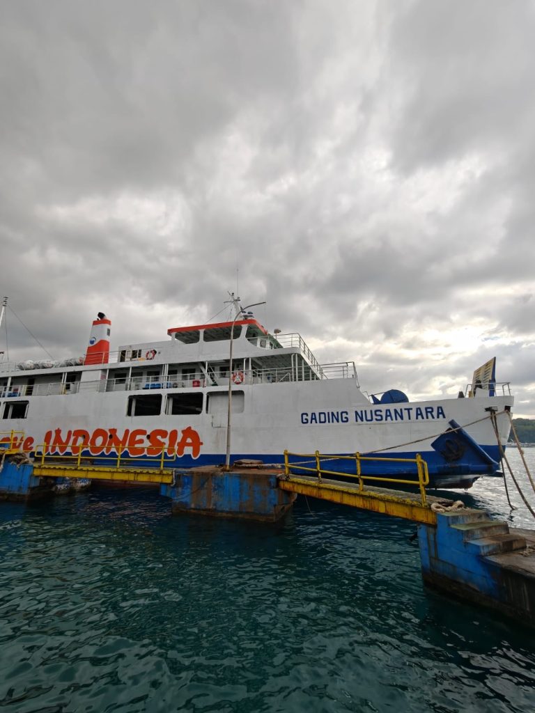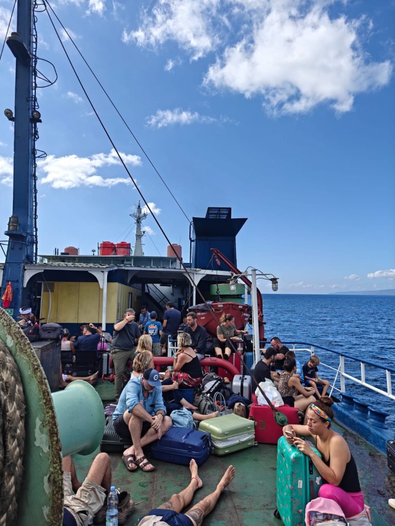4-5h mit der Slow Ferry von Padang Bai nach Lembar, dem Hafen von Lombok im Süden. Wer nachgeschaut hat, hat vielleicht bemerkt dass unsere Insel im Westen vom nördlicheren Teil Lomboks liegt. Also sollte es danach 2h mit dem Reisebus über Lombok gehen und zum Schluss nochmal mit der Fähre von Lombok nach Gili Trawangan. Insgesamt wohl eine Fahrt von 8-10h, das Schnellboot hätte übrigens 90min gebraucht 🙂 Wir schauten noch kurz in die Schnellboot Verkaufsstände von nebenan, angeblich hatte jeder ne größere Fähre die gefahren wäre und es sei alles kein Problem. Aber ob man dem trauen kann? Wir hatten bei der Buchung recht viel Aufwand hineingesteckt einen vernünftigen Fähranbieter auszuwählen und so entschieden wir uns dafür unserem lokalen Fähranbieter zu vertrauen und uns auf den Weg zu machen. Lieber langsam unterwegs sein und ankommen anstatt am nächsten Tag immer noch auf Bali festzuhängen weil die Fähre doch nicht fährt. Dann sollte alles auf einmal auch recht schnell gehen, wir sollten schnell zum Hafen und direkt auf die Fähre. Eigentlich hatten wir noch einen kleinen Puffer eingeplant um Frühstück zu holen. Naja, eigentlich… und so saßen wir dann ohne Frühstück im Magen auf einer Fähre die etwas in die Jahre gekommen war und sehr voll war. Immerhin gab‘s an Deck 43 Schwimmwesten 😉