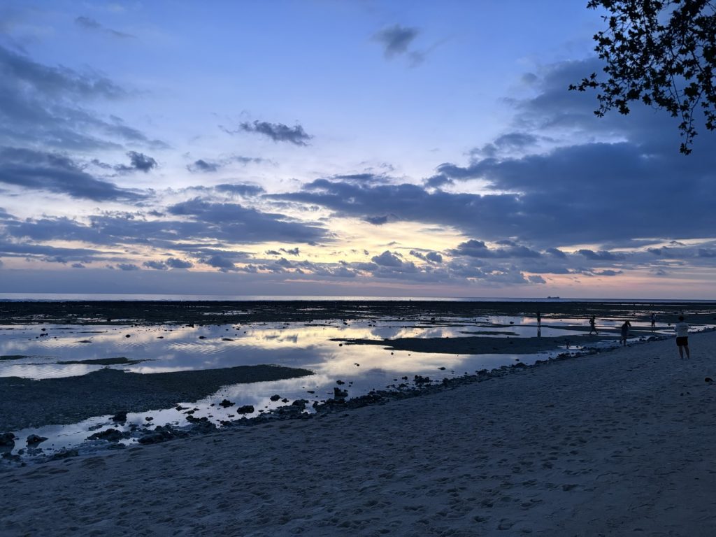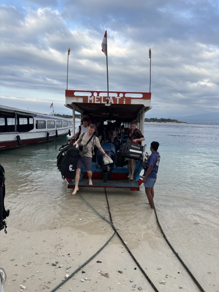 5h später waren wir dann auf Lombok, Mitarbeiter von unser Fährfirma zeigten uns den Weg zum Bus und danach ging es 2h vom südlichen Hafen zum nördlichen Hafen. Die Organisation war aber echt top, es gab Wasser und einen Stopp beim Supermarkt und der Bus ist ziemlich schnell abgefahren. Am Bangsal Port angekommen ging es dann auf die Fähre nach Gili Trawangan. Es gab jedoch keinen Anleger, man musste über den Strand laufen und dann durch Knietiefes Wasser auf die „Fähre“. Eine Erfahrung 😀
