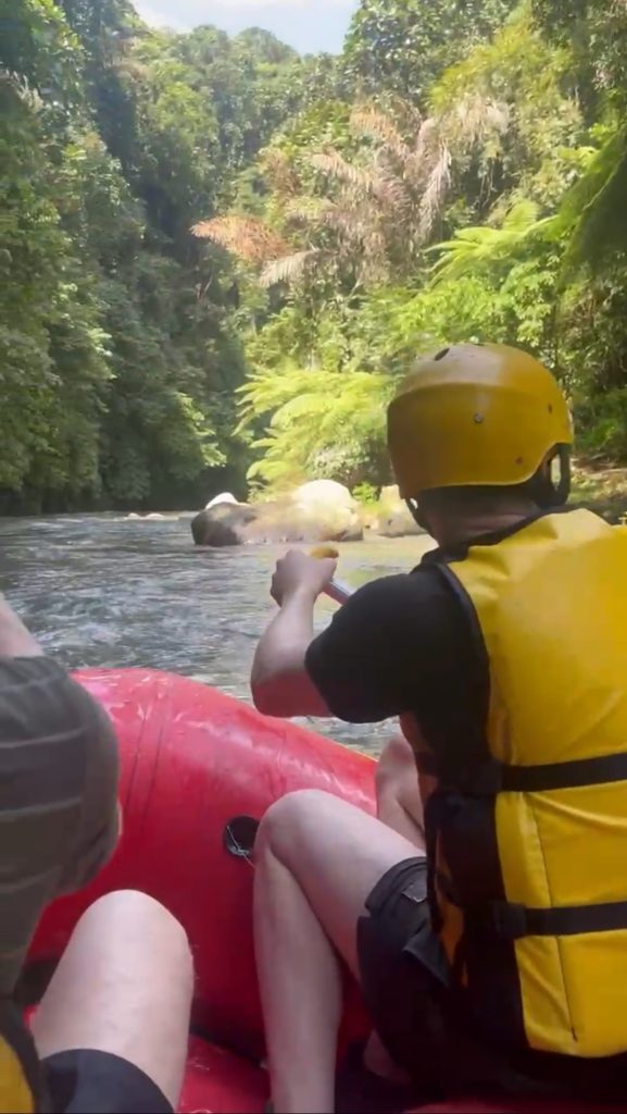 Kurzer Stopp beim Hotel fürs Frühstücken und danach sollte es zum Wildwasser Rafting auf dem Ayung Fluss gehen. Wir hatten nicht online gebucht sondern wollten spontan vorbei fahren und uns dann für einen seriös wirkenden Anbieter entscheiden. Vor Ort waren die meisten dann jedoch ausgebucht und wir entschieden uns für den Anbieter den man auch online noch buchen konnte. Der war zwar eigentlich auch schon ausgebucht, aber mit 45min Wartezeit hat sich für uns eine Lücke gefunden. Der Online-Preis waren ca. 20€/Person, vor Ort wollte man zunächst 60€/Person haben. Am Ende haben wir vor Ort den Online-Preis gezahlt 😉
